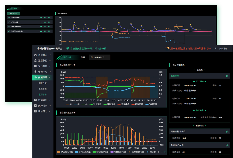 EMS系統(tǒng)支持全面的場(chǎng)站能源控制策略,包括并網(wǎng)待機(jī)、循環(huán)充放、削峰填谷、光儲(chǔ)協(xié)同、離網(wǎng)備電、自定義策略、防逆流、防孤島運(yùn)行、以及需量控制等。場(chǎng)站可以根據(jù)自身需求、當(dāng)?shù)仉妰r(jià)策略以及實(shí)際生產(chǎn)用電情況,按天設(shè)置相應(yīng)的控制策略。同時(shí),系統(tǒng)支持連接云涌VPP運(yùn)營(yíng)管理系統(tǒng),接收虛擬電廠平臺(tái)下發(fā)的需求響應(yīng)策略并執(zhí)行。