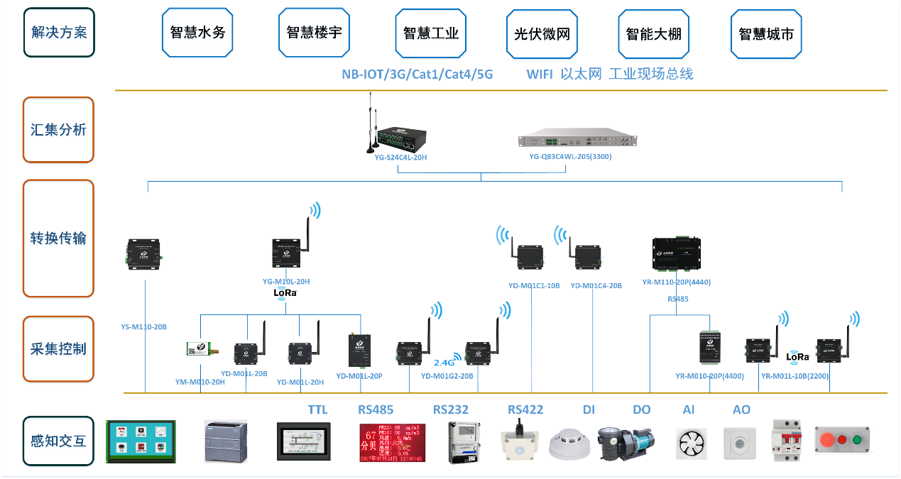云涌科技智慧物聯(lián)網(wǎng)產(chǎn)品系列覆蓋采集控制、數(shù)據(jù)傳輸、數(shù)據(jù)分析等應(yīng)用場景,同時支持以太網(wǎng)、RS485、RS232、RS422等現(xiàn)場總線,支持模擬量和數(shù)字量的輸入和輸出,也支持4G CAT1、4G CAT4、LoRa、WIFI等無線傳輸方式,能滿足現(xiàn)場復(fù)雜的通訊需求。