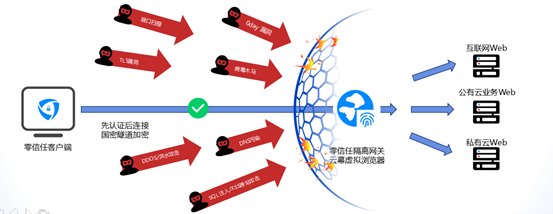 建立終端到遠(yuǎn)程隔離服務(wù)的國(guó)密加密隧道,隧道根據(jù)終端運(yùn)行環(huán)境和用戶身份安全評(píng)級(jí)實(shí)現(xiàn)隧道動(dòng)態(tài)建立和銷毀,始終保持最小訪問授權(quán)。