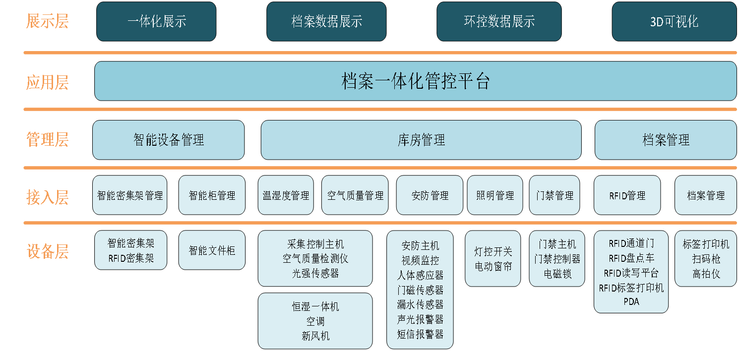 智慧檔案庫房一體化管控平臺建設(shè)方案由實體檔案管理、檔案存儲設(shè)備管理、檔案庫房環(huán)境管理、檔案庫房安全防范管理等多種管理方式組成。不僅保障了檔案管理的規(guī)范化、智能化,還為檔案館的環(huán)境和安防提供了改善和管理途徑。使傳統(tǒng)的檔案管理朝著網(wǎng)絡(luò)化管理方向發(fā)展,打破了層級、部門之間的限制,促使檔案管理人員和職能部門進(jìn)行協(xié)調(diào)互通,使檔案管理的程序和操作流程更加簡明、暢通。