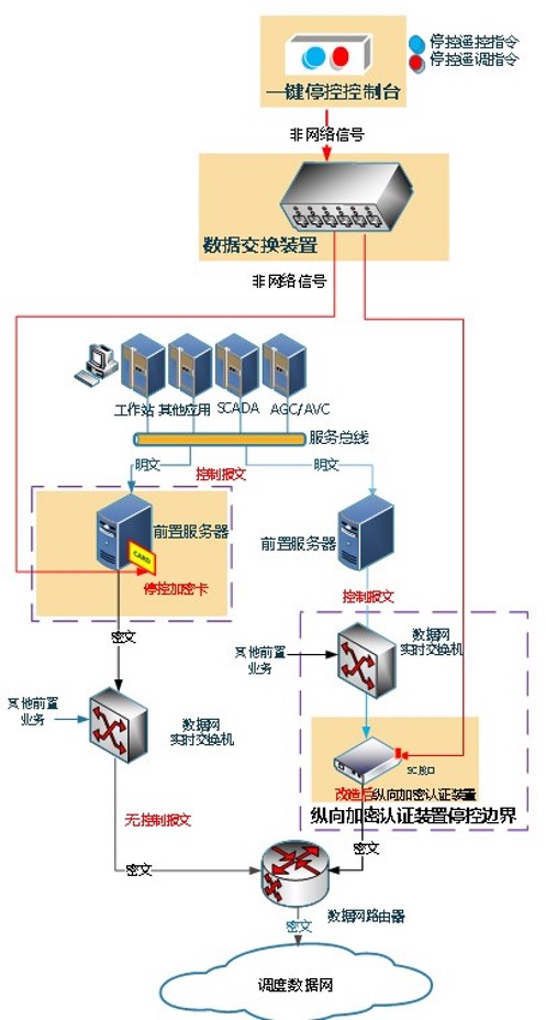 停控縱向加密認證裝置:基于縱向加密認證裝置進行改造的新型裝置,具備識別控制臺指令,用于防止主站網(wǎng)絡安全事件的影響向廠站大規(guī)模蔓延,默認情況下處于縱向加密認證裝置的原有工作模式運行,緊急情況下可通過非網(wǎng)絡方式啟動阻斷模式運行,阻斷攔截主站下發(fā)廠站的遙控、遙調命令,以下簡稱“??乜v向裝置”。