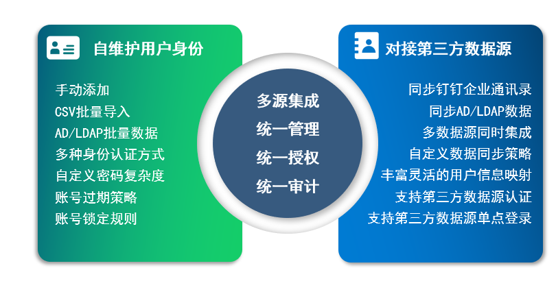 云涌零信任安全管理平臺既支持主流企業(yè)通訊錄系統(tǒng)的數(shù)據(jù)導(dǎo)入與同步,也支持自建用戶體系。實(shí)現(xiàn)了在一個(gè)平臺對企業(yè)人員、部門以及角色組的統(tǒng)一高效管理。同時(shí)系統(tǒng)提供多種用戶認(rèn)證方式,全方位滿足各種需求場景。