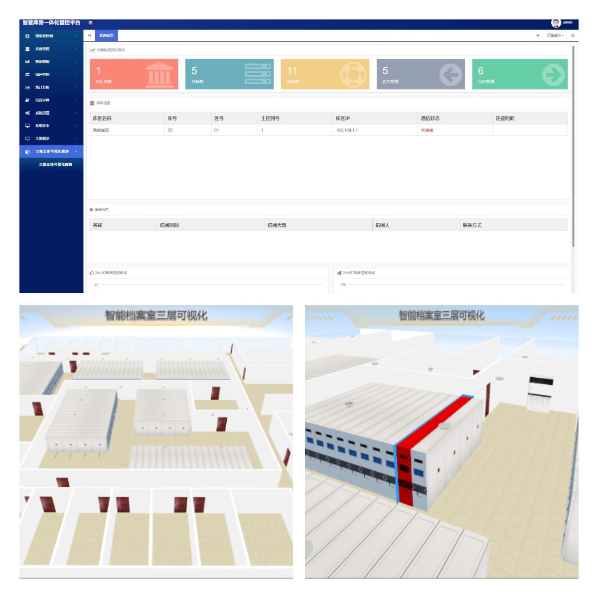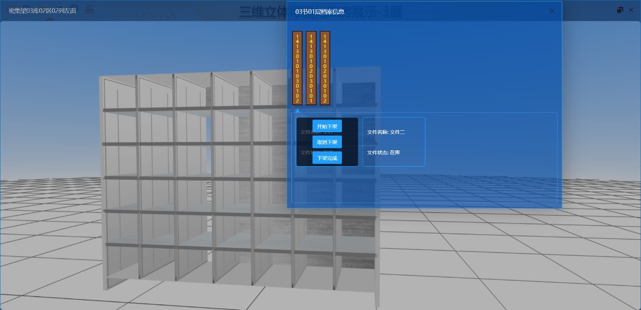 本系統(tǒng)結(jié)合用戶的深度業(yè)務(wù)邏輯,通過(guò)Three.Js三維可視化技術(shù)搭建數(shù)字孿生模型,使用IOT技術(shù)、運(yùn)行歷史數(shù)據(jù),多尺度、多概率的仿真過(guò)程,在虛擬空間中完成映射,將真實(shí)設(shè)備與數(shù)字模型進(jìn)行耦合交互,實(shí)現(xiàn)設(shè)備實(shí)時(shí)運(yùn)行狀態(tài)與數(shù)字孿生對(duì)象動(dòng)作對(duì)應(yīng)(支持密集架開(kāi)啟、關(guān)閉、查詢文件等)。