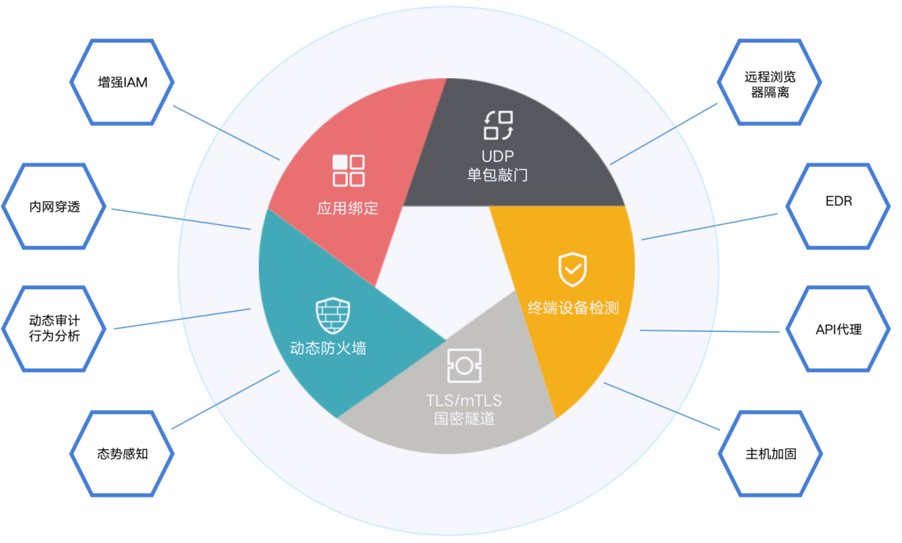 ? ? ? 本方案融合了當(dāng)前最新的安全技術(shù)通過聯(lián)動的安全矩陣設(shè)計(jì),形成一個整體的安全閉環(huán)。安全矩陣主要包括:SDP安全框架,遠(yuǎn)程瀏覽器隔離,增強(qiáng)IAM, 端點(diǎn)檢測與響應(yīng)EDR,邊緣微隔離,內(nèi)網(wǎng)穿透,動態(tài)審計(jì)與行為分析,態(tài)勢感知,API代理、主機(jī)加固與可信計(jì)算。