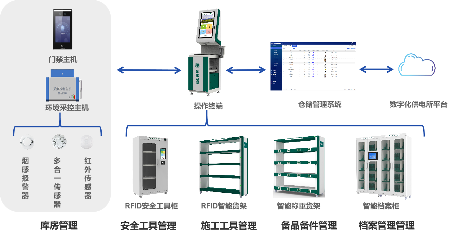 云涌科技從“四庫(kù)“不同管理需求出發(fā),以物聯(lián)網(wǎng)技術(shù)為支撐,將供電所中包含的實(shí)物管理、存儲(chǔ)設(shè)備管理、庫(kù)房環(huán)境管理、庫(kù)房安全防范管理等多種功能集中于一體,打造供電所數(shù)字化倉(cāng)儲(chǔ)解決方案,將當(dāng)前的智能化管理水平延伸至最末端,完善物品全流程的管理,并為供電所倉(cāng)儲(chǔ)實(shí)現(xiàn)標(biāo)準(zhǔn)化、規(guī)范化、科學(xué)化、效能化提供了一套有力的工具,為供電所數(shù)字化提供有力支撐。