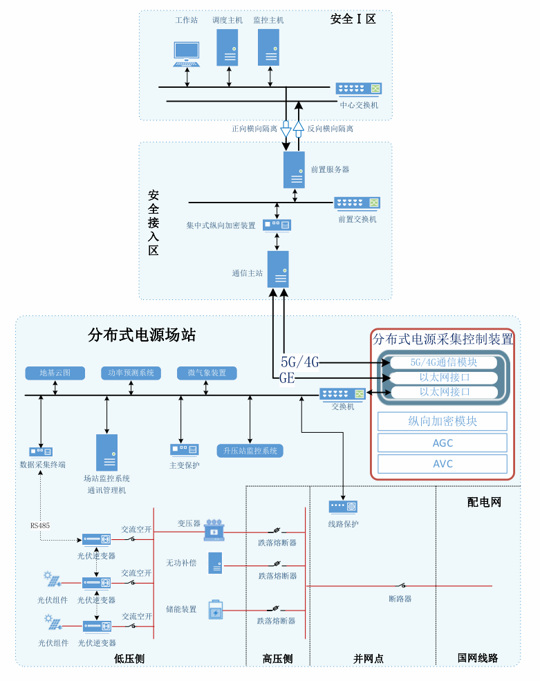 ???該裝置部署于分布式電源場站側(cè),基于無線專用通信網(wǎng)絡(luò)架構(gòu),集成縱向加密單元、無線通信模塊及 AGC/AVC 控制功能,通過電力專用通信通道接入生產(chǎn)控制大區(qū)安全接入?yún)^(qū),與調(diào)度主站建立安全通信鏈路,實現(xiàn)數(shù)據(jù)傳輸?shù)目煽啃耘c安全性。