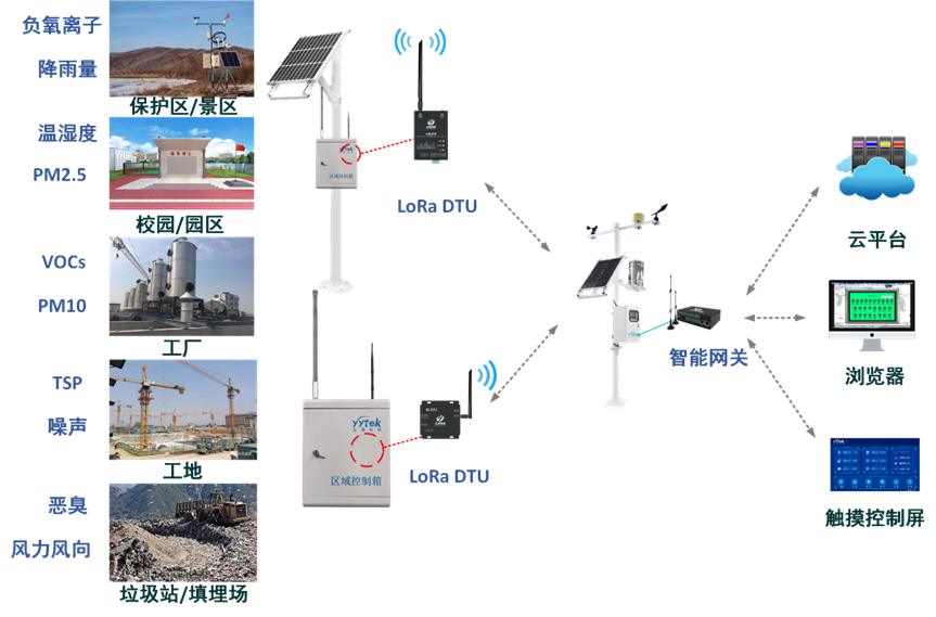 ? ? ? 城市霧霾、工業(yè)廢氣污染、尾氣排放、工地揚塵等,都是國家關注和治理的對象,對于這些污染源頭,我們通過環(huán)境監(jiān)測系統(tǒng),運用傳感采集設備、聯(lián)網傳輸設備、數據顯示設備、邊緣計算設備等,實現(xiàn)了對pm2.5、pm10等污染物指數、溫度、濕度、氣壓、噪音、風向、風速等環(huán)境參數的采集,并通過物聯(lián)通訊設備將這些現(xiàn)場的數據傳輸到智能網關或者遠程服務器上,便于管理人員及時掌握現(xiàn)場監(jiān)測數據。針對蜂窩數據信號比較好的地區(qū),我們可以使用 LTE DTU將數據直接透傳至平臺,針對偏遠地帶或者信號受屏蔽地區(qū),我們可以采用LoRa DTU進行數據采集和中繼傳輸,然后使用智能網關進行數據處理和環(huán)保平臺對接。