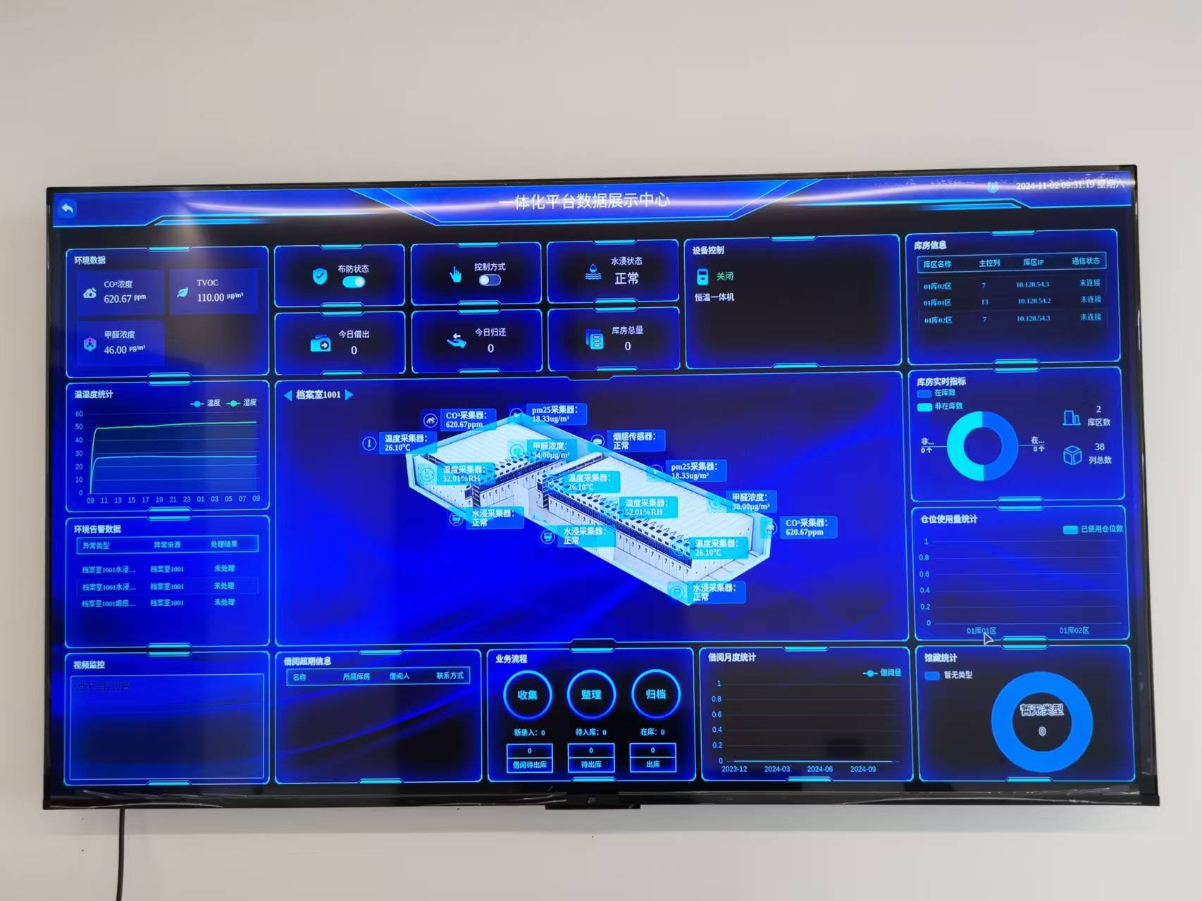 通過液晶顯示大屏來展示環(huán)境數(shù)據(jù)信息、檔案位置的引導(dǎo)信息、設(shè)備報警信息等。