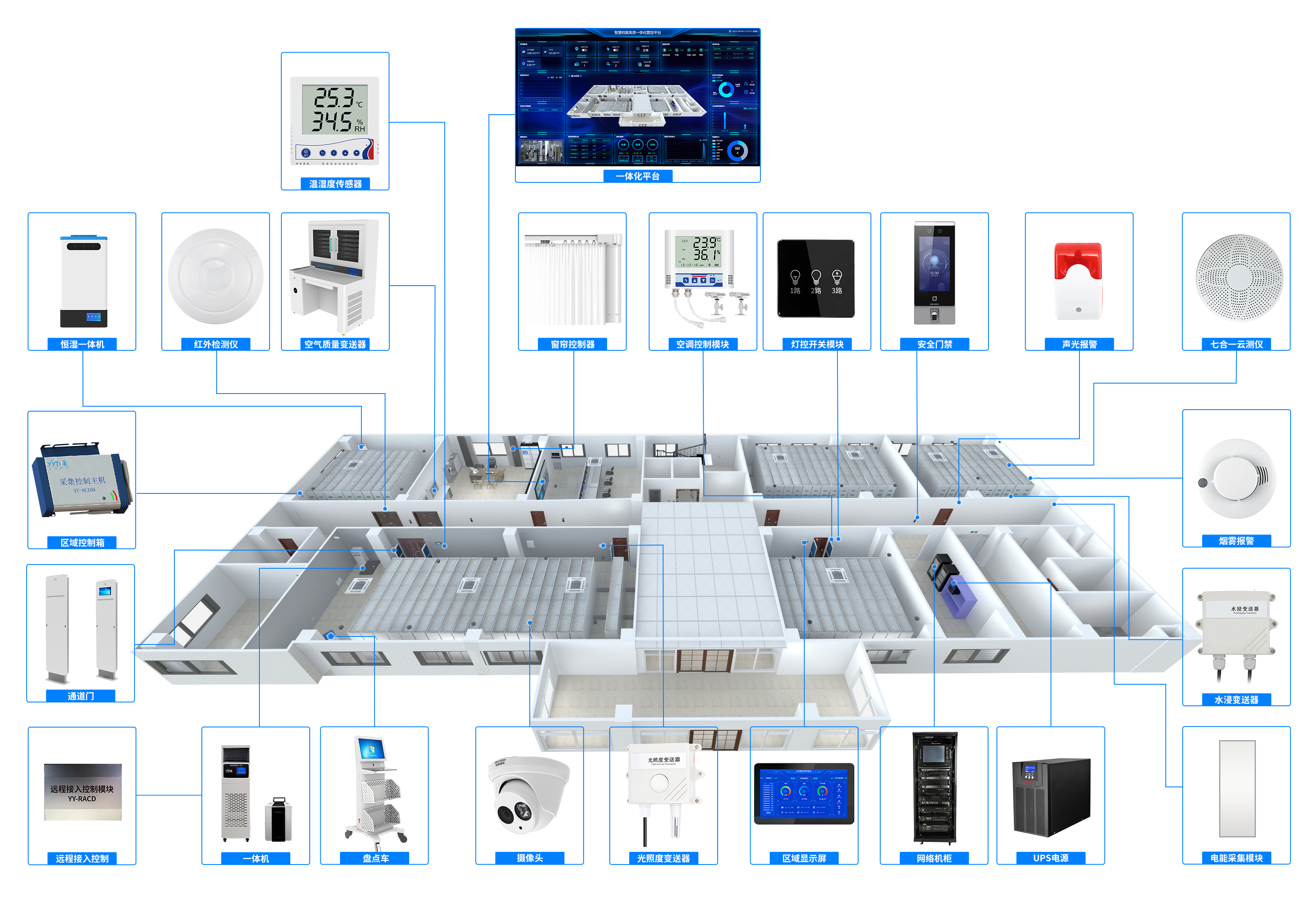 采集所有檔案室內(nèi)的溫度、濕度、漏水、煙霧、空氣質(zhì)量、人員侵入等數(shù)據(jù),并能夠通過控制空調(diào)、凈化一體機(jī)等設(shè)備,達(dá)到自動調(diào)節(jié)溫濕度及空氣凈化的目的。